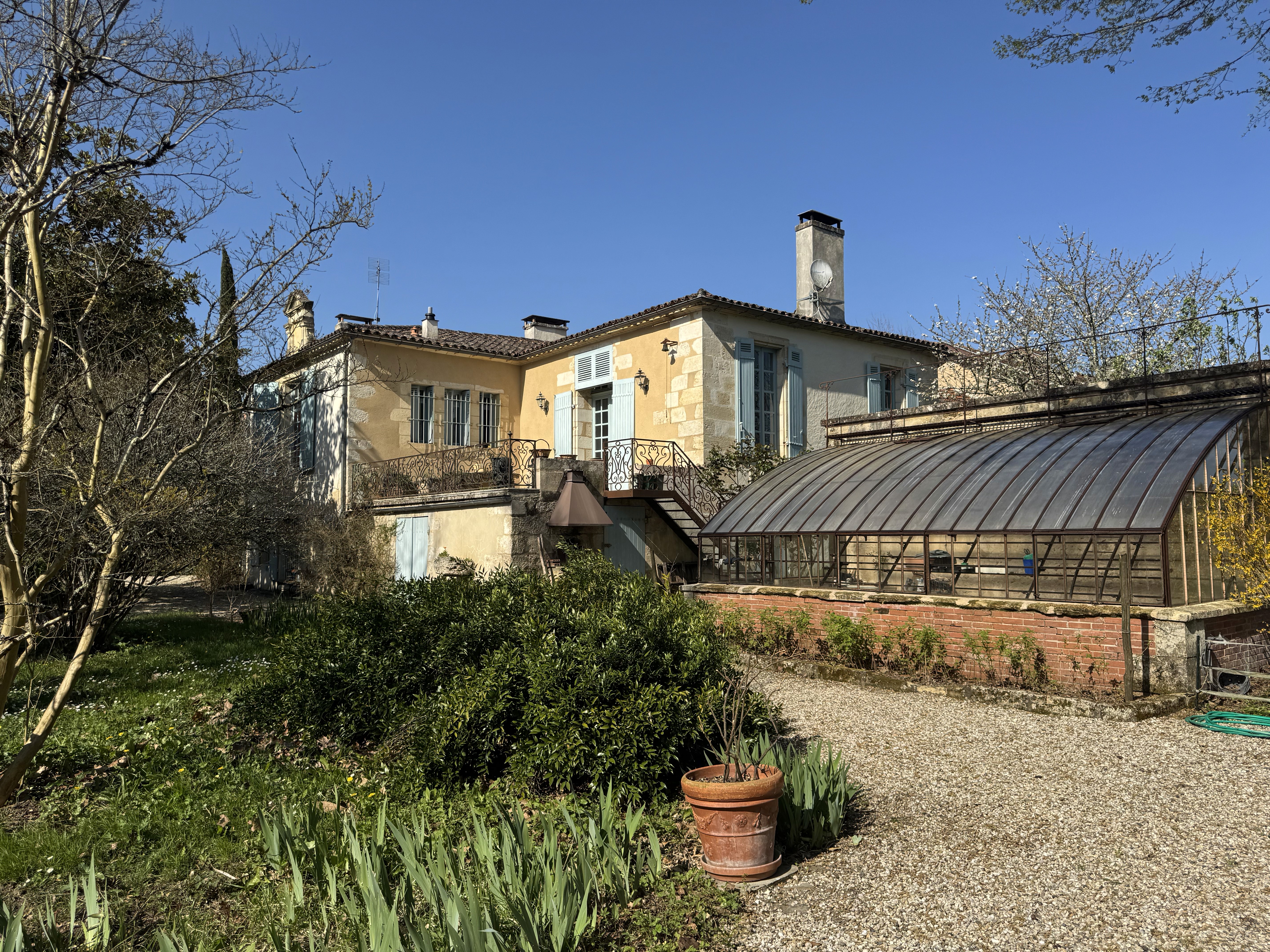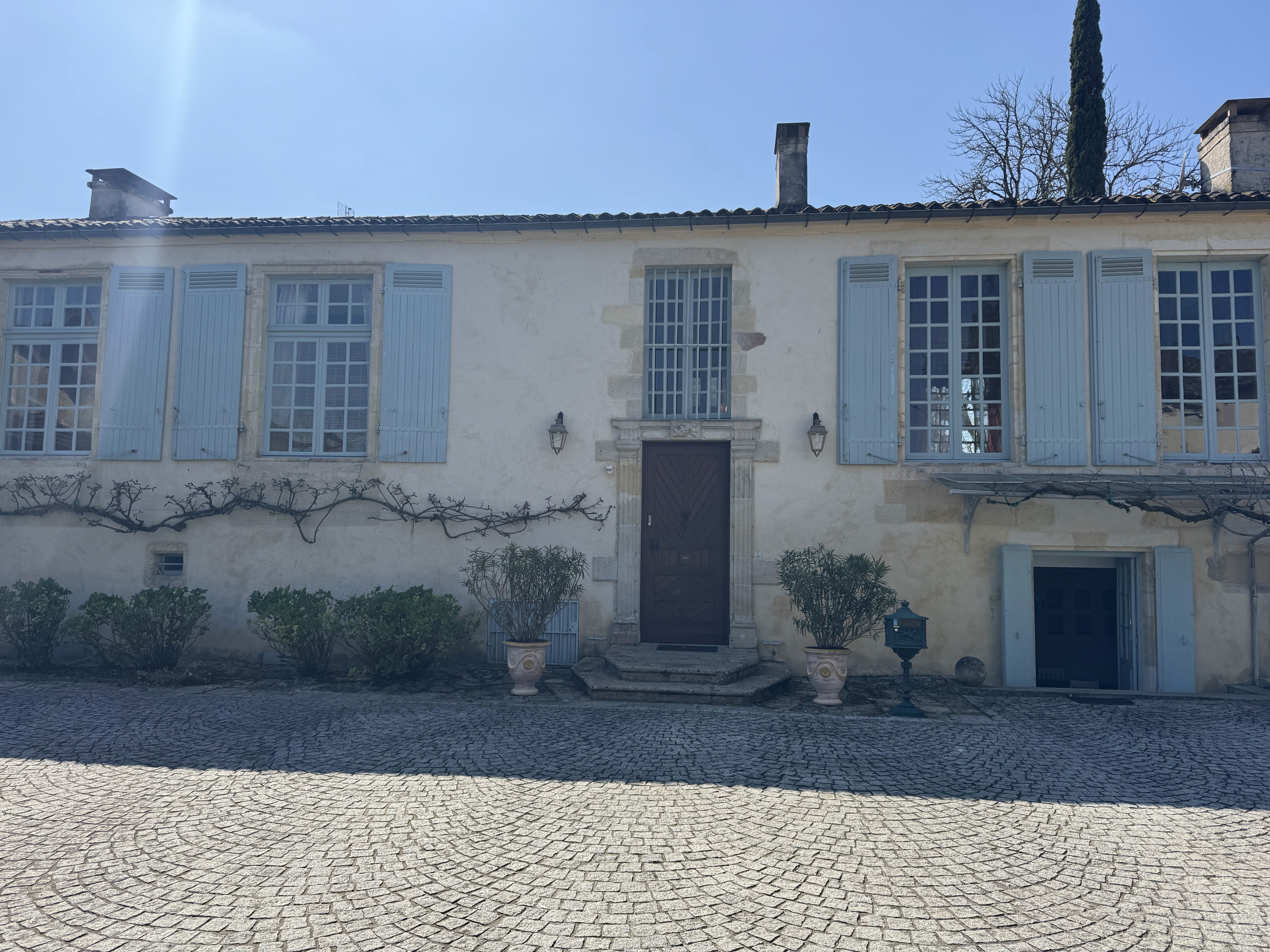 A private estate above the Garonne valley, inside one of the oldest medieval villages in the Bordeaux region. Thirty minutes from Bordeaux. Four hectares of grounds. 800 square metres of historic buildings.